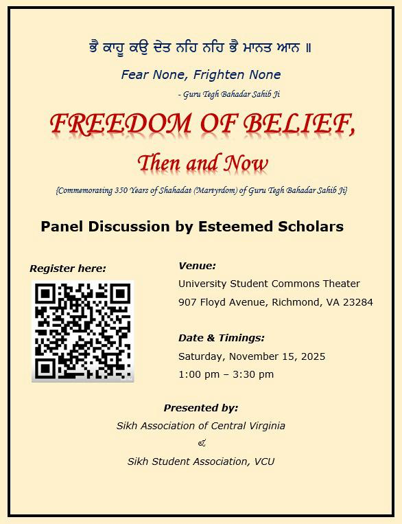 Waheguru Ji Ka Khalsa! Waheguru Ji Ki Fateh! SACVI is Commemorating350 Years of Shahadat (Martyrdom) of Siri Guru Teg Bahadur Ji. Join the Panel Discussion by Esteemed Scholars. Featuring Panelists: …
